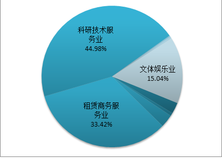 2015年,新设现代服务业企业中,排名前三位的是科学研究和技术服务业,租赁和商务服务业,文化、体育和娱乐业三大行业,新设户数占比分别为44.98%,33.42%,15.04%,合计占全市现代服务业新设企业的93.46%。